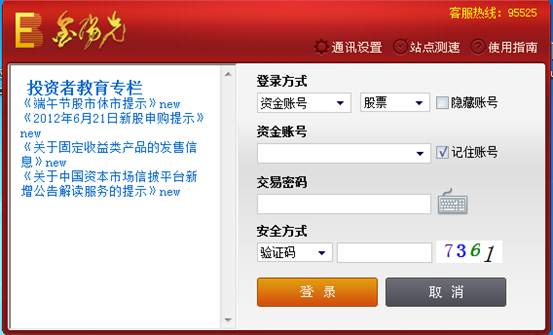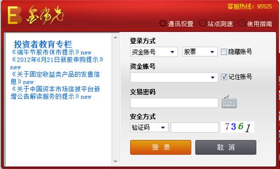 如果您已经是光大证券的交易客户,则系统默认您为金阳光交易客户,请直接在登录界面上,选择“资金账号”登陆方式,输入您的账号(资金帐号也称客户号)、密码和验证码完成登录。