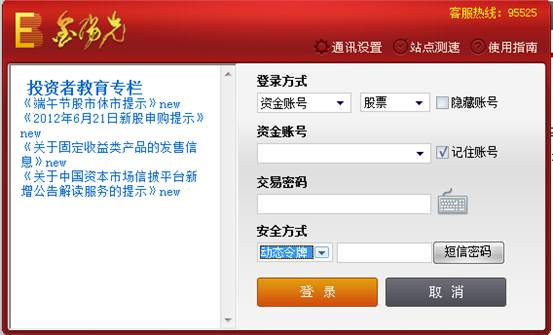 登陆时,安全方式选择【动态令牌】,输入资金账号、交易密码之后,按一下从营业部领取的动态令牌,输入生成的6位数字,然后点击登陆按钮,即可登陆交易。