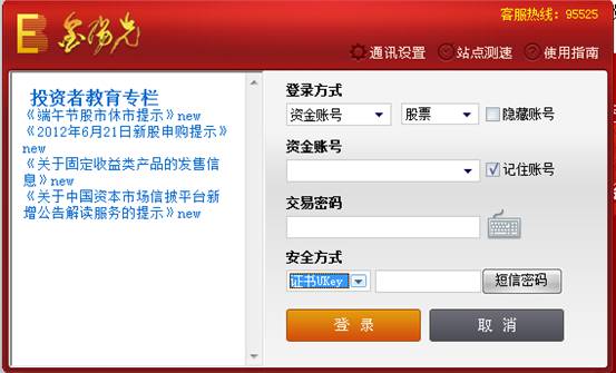 登陆时,安全方式选择【证书UKey】,插入从营业部领取的证书UKey,输入资金账号、交易密码之后,Ukey的PIN码,然后点击登陆按钮,即可登陆交易。