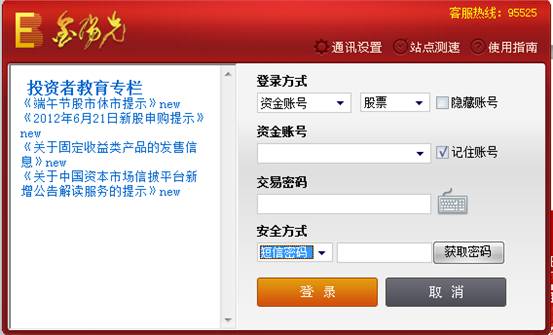 登陆时,安全方式选择【短信密码】,输入资金账号、交易密码之后,点击【获取密码】,会弹出【获取短信密码】的对话框。