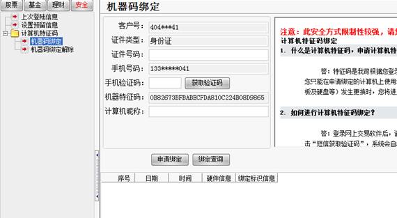 此时,打开【安全】菜单会发现只有计算机特征码部分,需要进行绑定之后才能继续进行交易等操作。