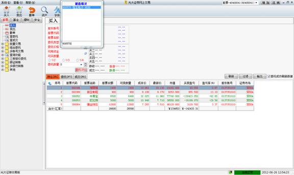 当用户在输入股票代码时,右边会显出一个选择框,而且在填写股票代码时可支持拼音。在右边的持仓表按右键选择“市价买入”来操作。市价买入的基本功能与买入的功能界面相同。
