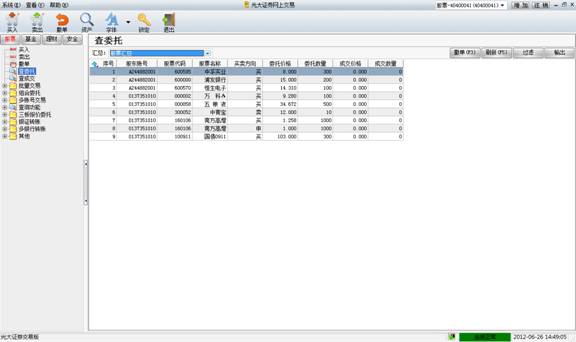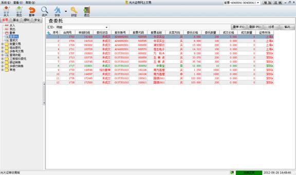 当鼠标点击【查委托】,系统将自动显示当日委托股票的详细情况,如:委托时间、合同号、证券代码、证券名称、买卖方向、委托数量、委托价格、股东代码、如图所示:
